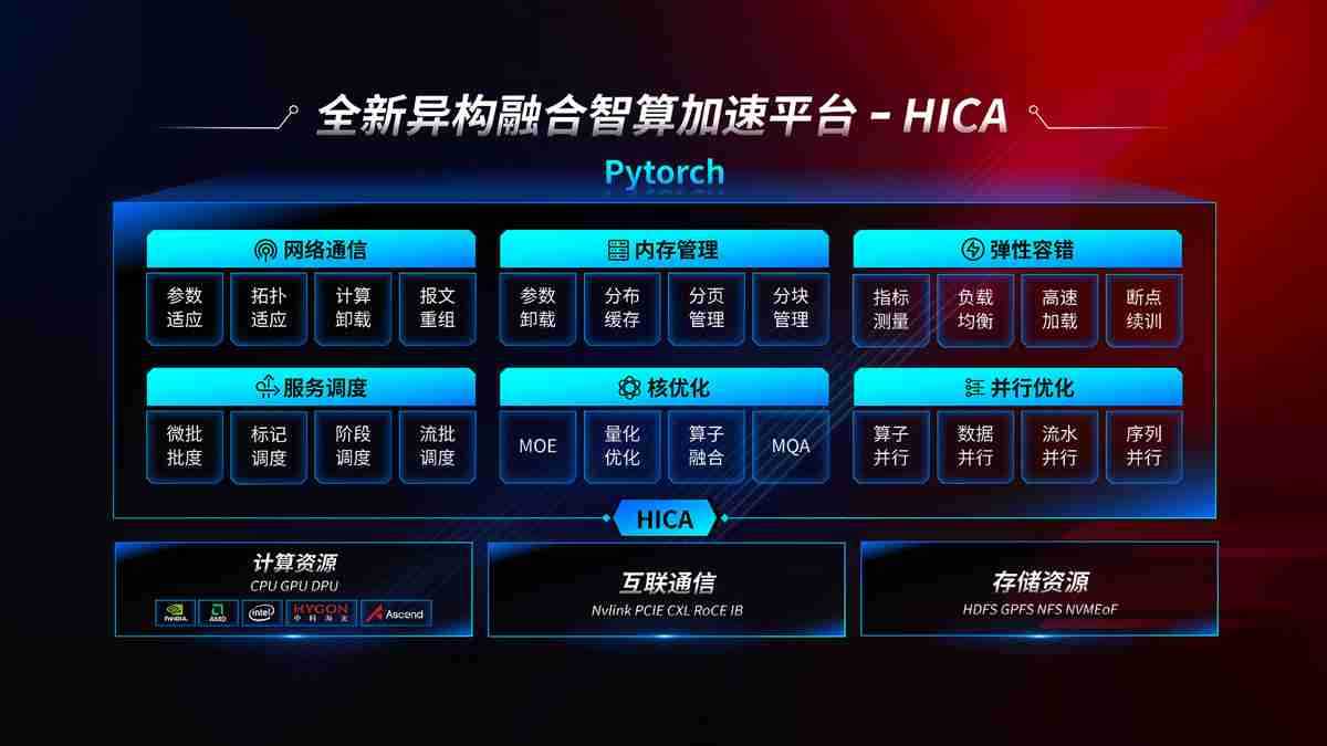 通过自研的服务层、、、中间适配层、、、、以及调度编排算法,,,采用数据并行、、、、模型并行等多种并行方式,,,把并行计算任务进行有效的分解,,,,使其分别由相应的软件栈和算力资源来承接。。。。当GPU资源变化,,,,HICA可以实时动态调度计算子任务并调整模型拓扑和架构,,,,以充分聚合各种算力资源。。